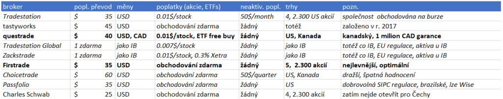 Ve zkratce: české klienty akceptuje jen několik málo US brokerů. Asi před rokem jsem si dělal malé srovnání – přikládám ho níže. Společný jmenovatel těchto společností jsou drahé a neergonomické převody hotovosti v USD, jediná povolená měna USD a omezení na ryze US trhy.