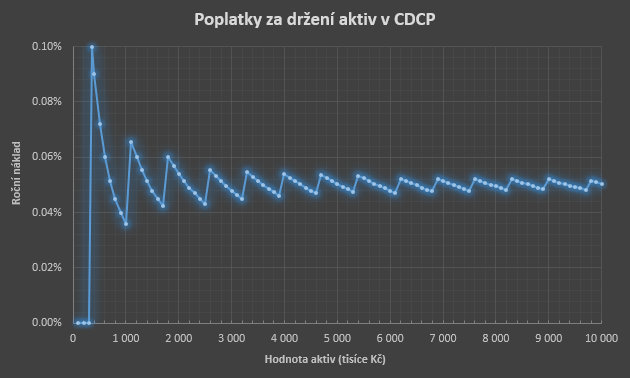 A k té poznámce o Centrálním depozitáři? V jejich ceníku se dozvíte komplikovaný způsob výpočtu poplatku. Tak komplikovaný, že na to radši udělali kalkulačku. Ale ta poměrně zdárně zakrývá relativně zvrhlou povahu poplatkové struktury. Efektivní procentuální roční poplatek v závislosti na hodnotě vašich uložených aktiv jsem proto radši zobrazil graficky: