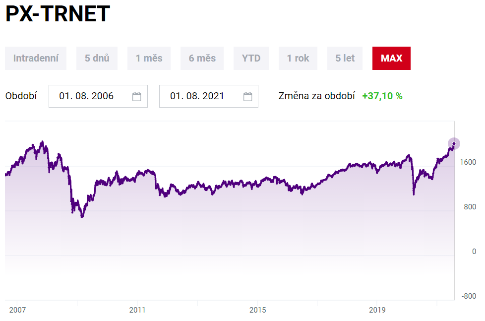 I během psaní se těm 2% zdráhám uvěřit a znova kontroluju výpočet. Ale je to tak. Podívejte se sami. Tohle je screen shot přímo z webu PSE přes zmiňované 15leté období, tedy 1. 8. 2006 – 1. 8. 2021. Připomínám, že od roku 2006 se index PX-TRnet zveřejňuje, jen jsem zvolil měsíce tak, aby byl interval v celých násobcích let. Nejde o žádnou speciální volbu intervalu tak, aby to vyšlo nějak nehezky. Ostatně, sami vidíte, graf je relativně plochý a nestrefujeme se do maxima před krizí z r. 2009. Graf uvádí zhodnocení 37,10% po dobu 15 let, takže anuizovaně to je 1.371^{1/15}\approx 1.022 p. a., nevymýšlím si. Ještě jednou nechme tu informaci působit: 2% ročně po dobu 15 let. Jako malé srovnání si neodpustím podívat se na české státní dluhopisy obchodované na PSE v té době: 11letý 2010–2021 nominálně za 3,85%, 15letý 2009–2024 za 5,70%, nebo snad nejbližší našim investičním datům byl 15letý 2007–2022 za 4,70%. Takže asi tak.
