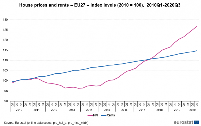 Ano, Češi jsou sice fascinovaní vlastnictvím nemovitostí, ale prudké zdražování cen bytů navzdory relativně pomalému zdražování nájmů je trend celoevropský, jak připomíná Eurostat: