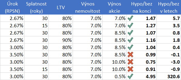 Nabízí se nyní plno otázek. Ten model je samozřejmě dost citlivý na odhad výnosů. Příklad výše jsem naschvál vybral tak, aby silně nahrával variantě A) s hypotékou. Pokud vezmeme v potaz pravděpodobné zvýšení úrokových měr, očekávané vyšší zhodnocení akcií, nebo třeba jenom kratší hypotéku, vždy to výhodnost varianty A) ještě sníží. Ba dokonce při některých okolnostech vyjde i finančně lépe žádné peníze si nepůjčovat. Různé varianty jsem nakonec shrnul do následující tabulky. Vezměte si z toho situaci, kterou považujete za nejpravděpodobnější, nebo si jenom prostě prozkoumejte hranici mezi výhodností života s hypotékou a bez ní. Na konec jsem přidal srovnání se spořícím účtem.