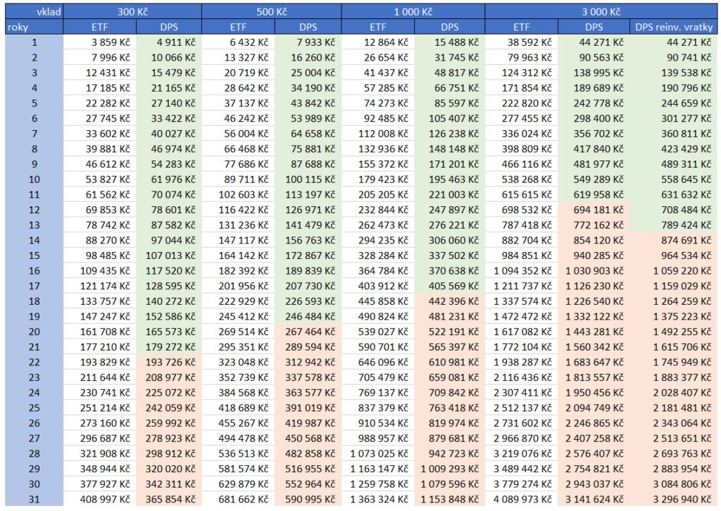 V případě využívání daňové úlevy pro úložku 3.000 Kč uvažuju jak variantu, kde reinvestujeme nezaplacenou daň (což podle mě nedělá skoro nikdo) a variantu bez reinvestice. V tabulce jsou zeleně označeny roky spoření, kdy je portfolio penzijka větší než hypotetické ETF portfolio. Jak je krásně vidět, penzijko je výhodnější než ETF jen po nějakou dobu, pak vždy zvítězí pasivní investování. V případě 300 Kč úložky je to 16 let od založení, v případě nejvyšší úložky 3.000 Kč bez reinvestice pak je 9 let.