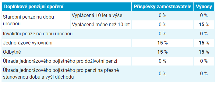 Pokud jde o danění výnosů, tak se s 15% daní shledáte skoro ve všech případech, vyjma výplaty renty při dosažení 65 let na dobu přesahující 10 let. V ostatních situacích daň platíte, i když jste investovali po dobu třeba 30 nebo 40 let. To mi přijde jako takový úlet, že doufám, že tomu ve skutečnosti nerozumím dobře. Například není daňový rozdíl mezi jednorázovým vyrovnáním po splnění téhle extrémně nelikvidní podmínky spořit celý život a mezi odbytným po 2 a více letech.