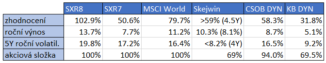 Přiznám se bez mučení, že jsem tím čas moc netrávil. Srovnal jsem hlavní indexy, naše PF a dynamické fondy ČSOBKomerčky. Hlavní parametry, tedy zhodnocení za posledních 5.5 roku (přesněji od 1. 1. 2016 až 7. 6. 2021), přepočtený roční výnos, roční volatilita zprůměrovaná za posledních 5 let a podíl akciové složky v aktivech, jsem shrnul do tabulky.
