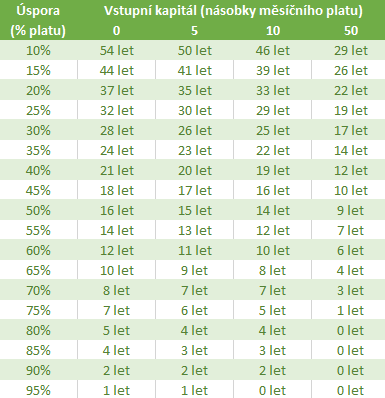 Tabulka je spočítaná pro 5% cashflow výnos (dividendy, kupóny, úroky) s totálním zhodnocením portfolia 5% nad inflaci ročně a výběr v důchodu na úrovni cashflow, což je velmi realistické nastvení a zanechává velký prostor pro chybu. Vyplývá z toho například, že pokud ušetříte polovinu příjmů a přihodíte jednorázově 5 platů, máte FIRE za 15 let; pokud vám zbývá čtvrtina příjmů, ale nemáte nic našetřeno, dosáhnete důchodu až v opravdu důchodovém věku (ale budete k tomu mít státní důchod 🙂 ). Naopak pokud ušetříte dvě třetiny příjmů, tak do důchodu můžete jít za méně než 10 let, podle dodatečného kapitálu.