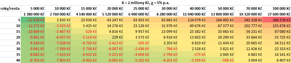 | Výnos p.a.\horizont | 1 rok | 2 roky | 3 roky | 5 let | 10 let | 20 let | 30 let | 40 let |