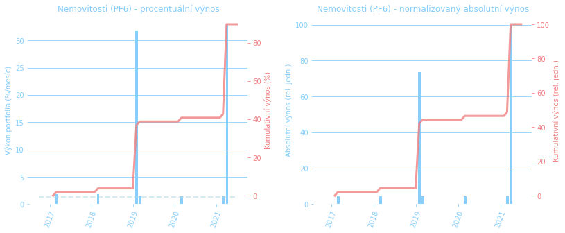 Do PF jsme tento měsíc zařadili i první investiční nemovitost. Máme ji už dlouho, ale pořád jsme váhali, jestli ji počítat jako investici. Jde o zemědělskou půdu na Moravě. Jelikož nám ale chodí poměrně pravidelně a poměrně agresivně vyznívající nabídky k odkupu od různých “zaručeně po zemědělčení prahnoucích” spekulantů, jsme schopni sledovat vývoj nabídkové ceny (realizační jsou asi ještě výše). Spolu s pachtovným tedy tento vývoj shrnujeme v novém segmentu PF 6, jehož grafy si můžete prohlédnout níže nebo podrobněji v přehledu portfolia v dolní části. Od roku 2017 zhodnocení asi 90%. Předchozí vývoj zmapovaný nemáme.