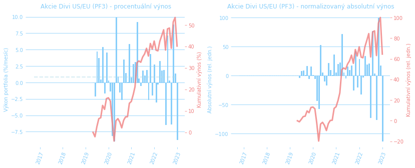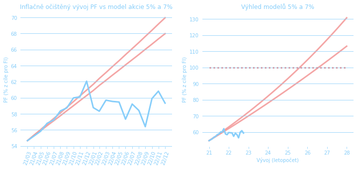Mezní situací pro PF byla ale inflace. Té se samozřejmě neubránil nikdo a za uplynutý rok nám zkonzumovala přes 15% majetku, za poslední dva roky pak téměř čtvrtinu (23,4%). Zde mluvíme o průměrném spotřebním koši, ale třeba potraviny vyrostly o 25,5%, resp. 30,6%, bydlení o 17,0%, resp. 22,6%, nebo restaurace o 25,5%, resp. 35,0%. Přestože třeba v roce 2021 se nám PF kapitálově zhodnotilo dost, rozhodně za poslední dva roky nebohatneme, naopak.