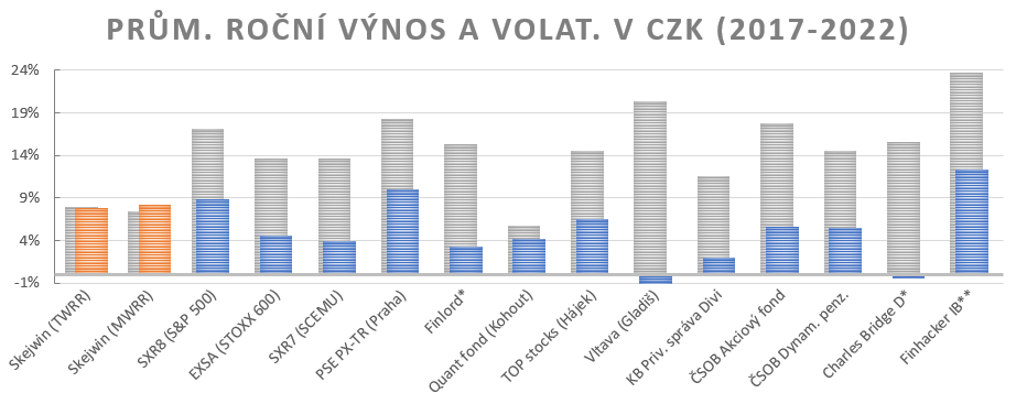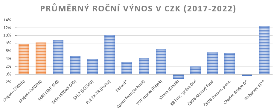 Srovnejme si průměrnou výkonnost našeho PF od roku 2017, tedy momentu, kdy jsme začali investovat relevantní peníze. Opět je vše přepočtené do CZK.