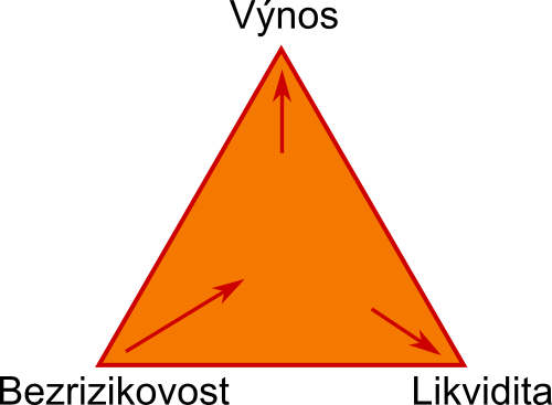 Jedno ze základních pravidel investování říká, že nelze mít všechno, a demonstruje se to na trojúhelníku níže. Investor se snaží maximalizovat všechny jeho vrcholy: VÝNOS — BEZRIZIKOVOST — LIKVIDITA. Empírie tvrdí, že plochu trojúhelníku se moc zvětšovat nedaří, jinými slovy, můžete zvyšovat dva parametry, ale vždy na úkor toho třetího. Akcie mají velké výnosy a velkou likviditu, riziko je ale větší. Dluhopisy riziko snižují na úkor výnosu a hlavně likvidity.