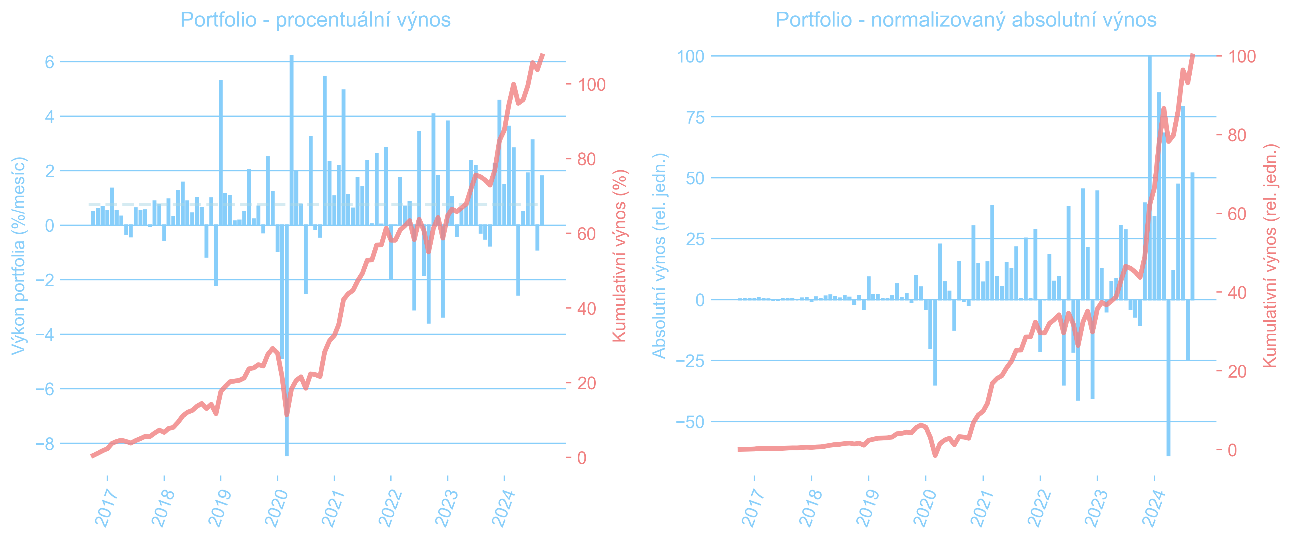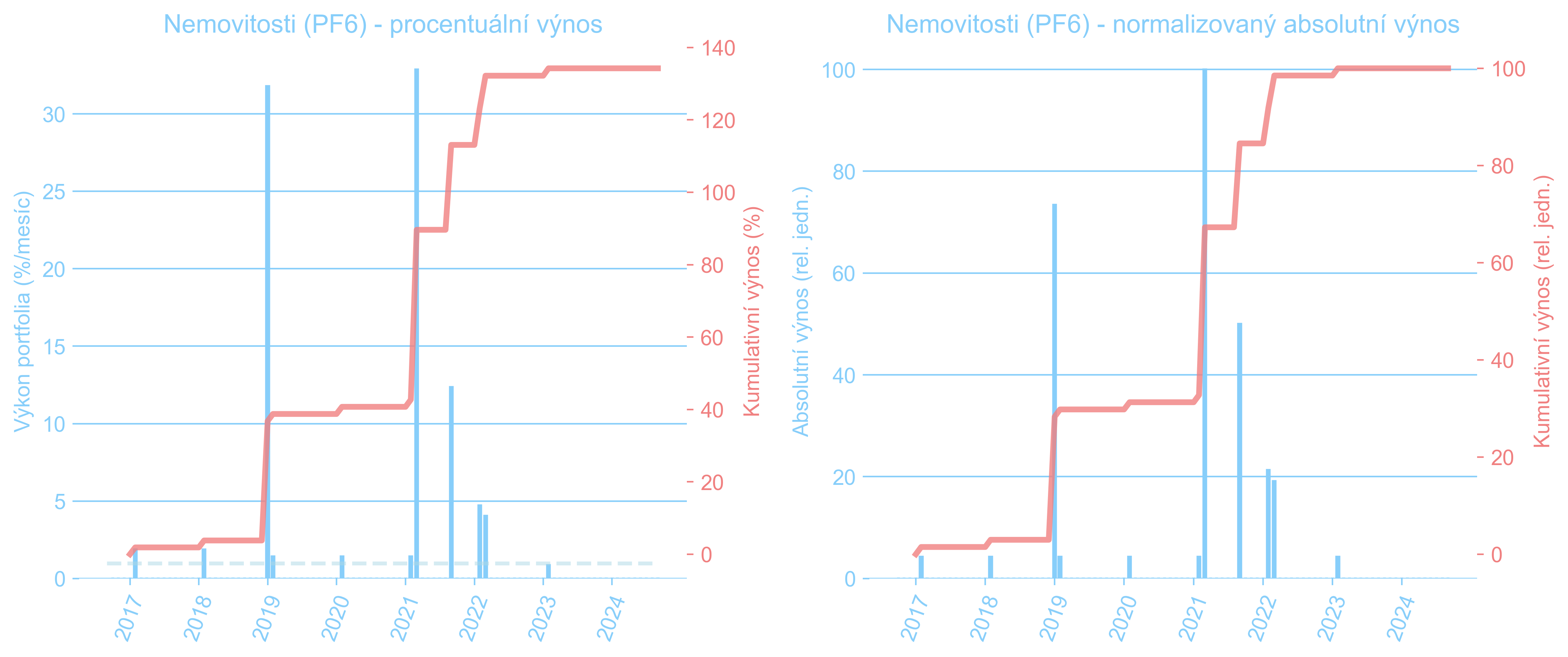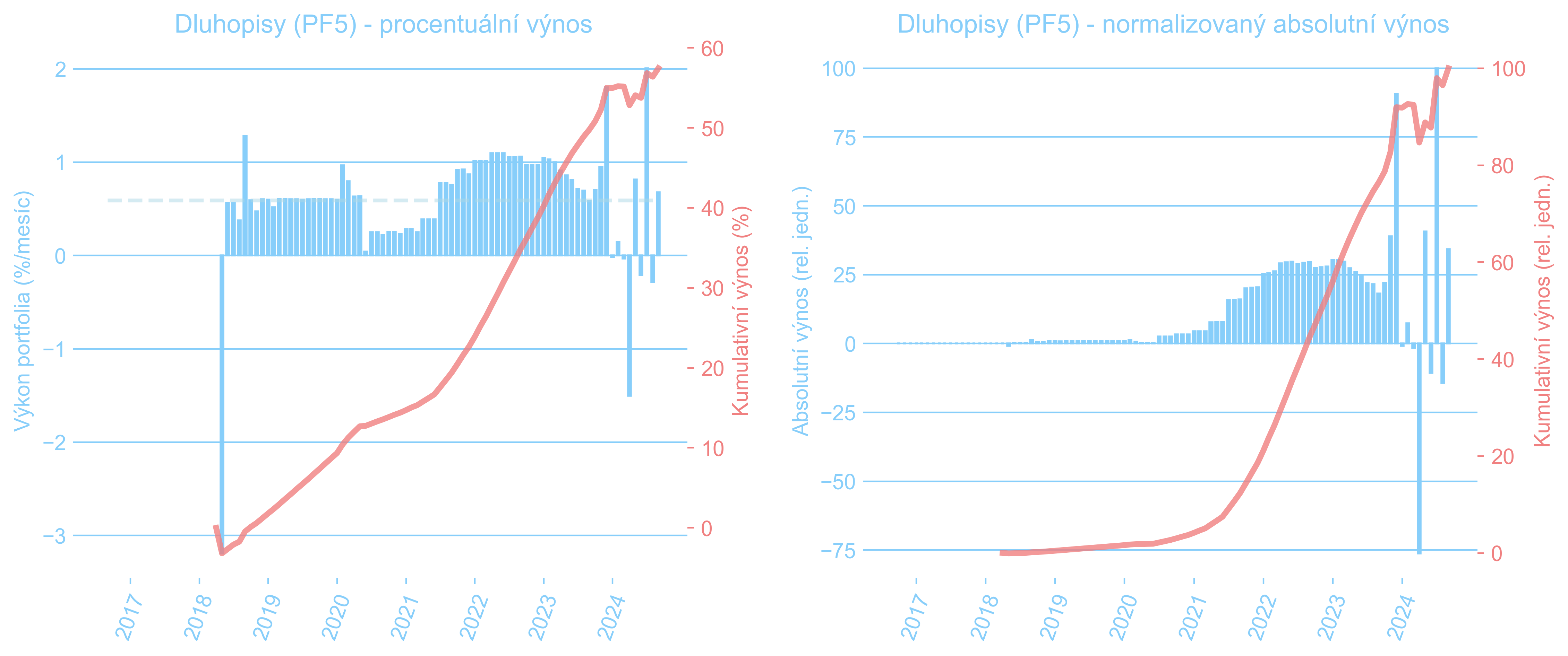 První procentuální pokles výkonnosti (květen 2018) je z důvodu diskontování ceny dluhopisu nakoupeného v půlce roku. Státní dluhopisy znamenaly zpočátku sice pokles úroku, ale díky úplně jinému rizikovému profilu jsme do nich mohli nalít mnohem více peněz – absolutní výnosy silně narostly. Posléze “díky” inflaci vyrostly i ty relativní. Významný nárůst ke konci roku 2023 je způsoben pohybem ocenění standardních státních dluhopisů, což je při očekávání klesajících sazeb ČNB standardní chování.