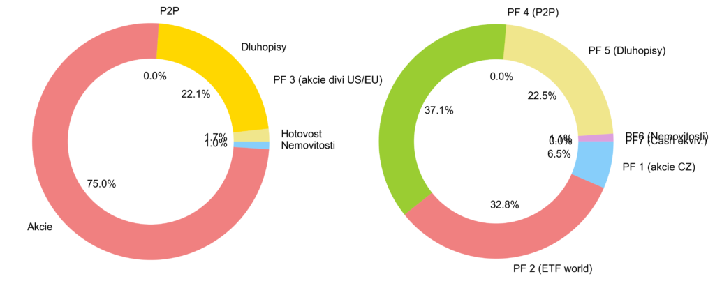 Možná přehlednější než samotná čísla jsou rozklady grafů pro jednotlivá subportfolia PF1–7, pokrývající naše různé investiční zaměření. Rychlé info o aktuálním rozložení PF do těchto složek ilustrují následující koláče (podrobnější, ale ne zcela aktuální strategii najdete v sekci Portfolio).