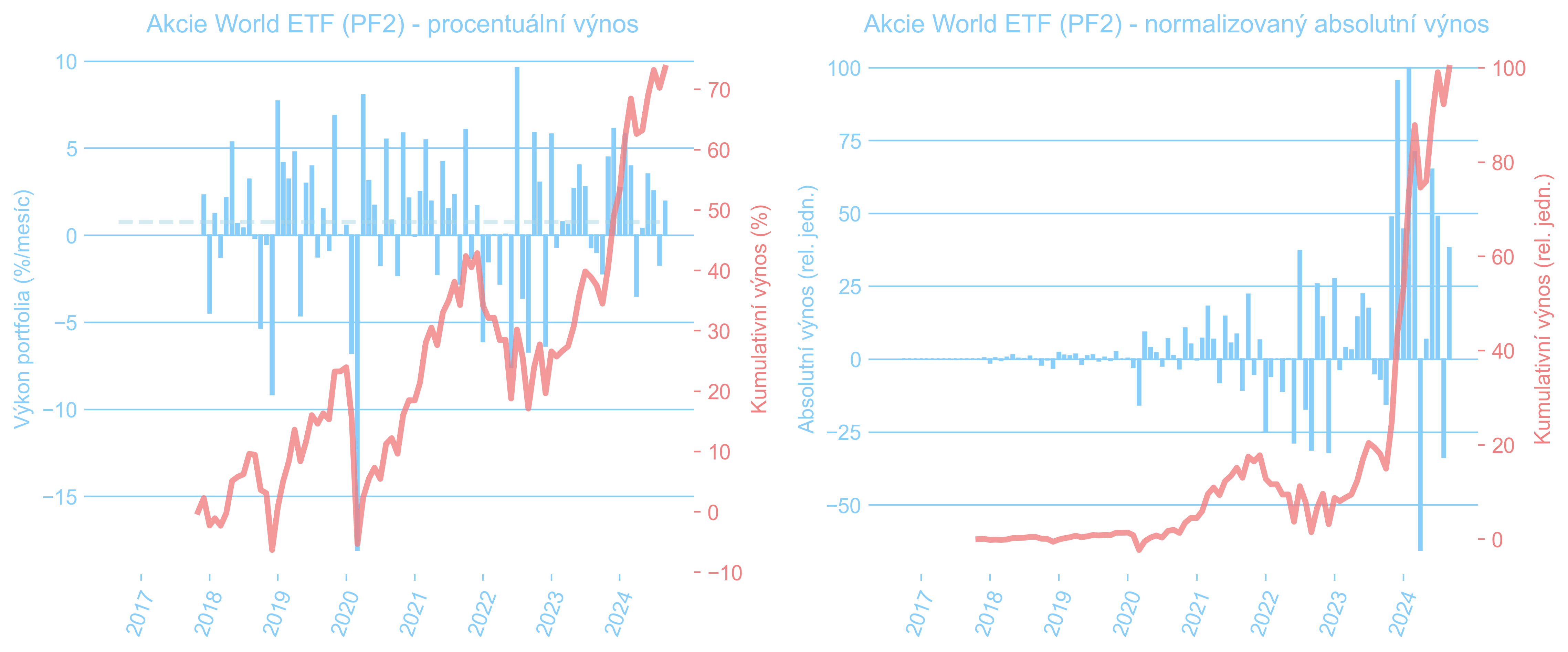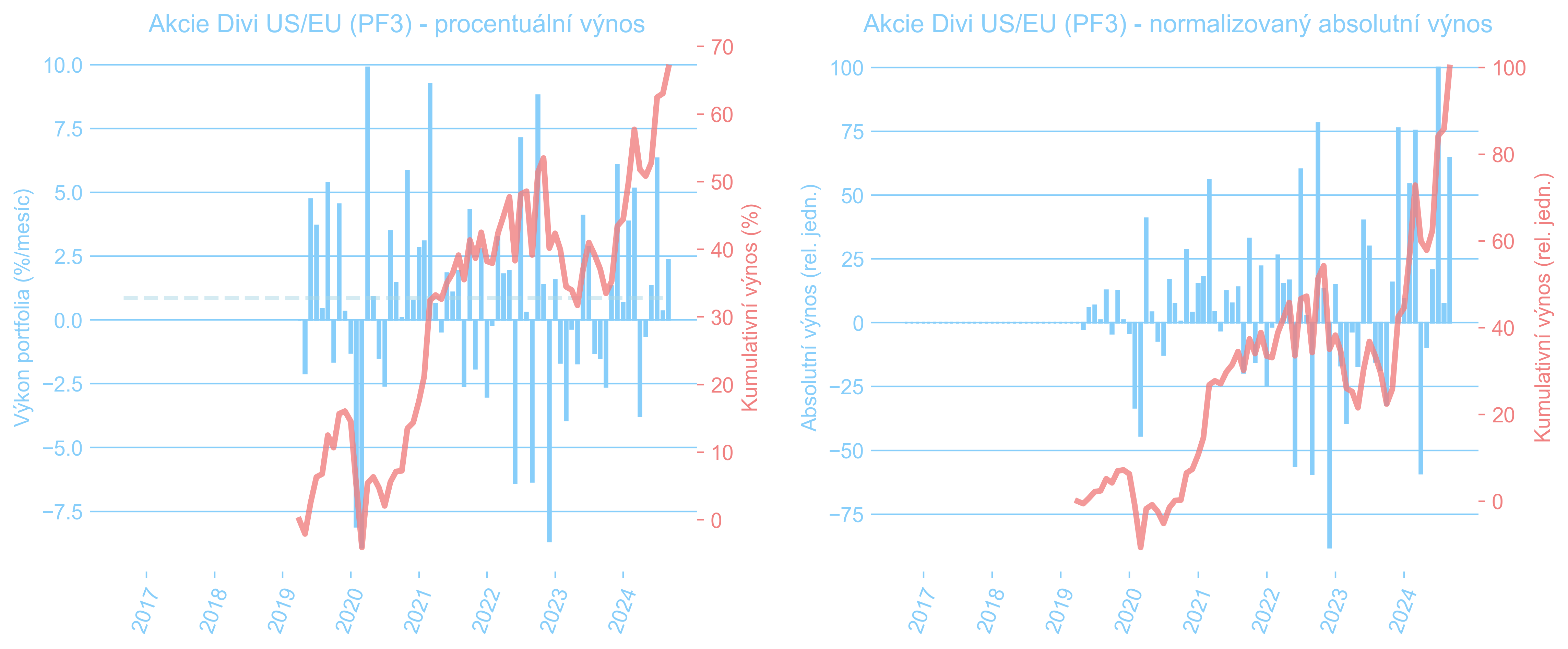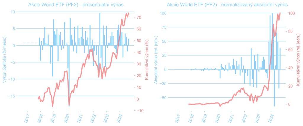 Grafy níže pak zase ukazují vývoj všech tří akciových sub-portfolií: české akcie (PF1), světové akcie prostřednictvím ETF (PF2) a americké a evropské dividendové akcie vlastněné přímo i přes ETF (PF3). Můžeme si všimnout, že růstové akcie, obsažené významně v PF2, se chovaly v letech 2022 a 2023 opačně, než hodnotové akcie z PF3. Když jedny byly pod silným tlakem, ty druhé měly tendenci posilovat. Takto se snažíme snižovat kolísavost celkového PF, které se posčítá do docela rozumné volatility a příjemného, i když možná ne tak rychlého, kontinuálního růstu.