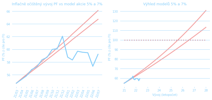 Srovnání růstu hodnoty PF vůči modelu uvažující zhodnocení na úrovni 5% a 7% nad inflaci. Vše vůči poměrně velkorysému finančnímu cíli. Jak vidíme, začátek roku 2022 je prostě špatná kombinace vysoké inflace a poklesu PF. Inflace přidává do tohoto grafu dodatečnou volatilitu, takže to asi bude krasojízda. Nechme se od života překvapit.