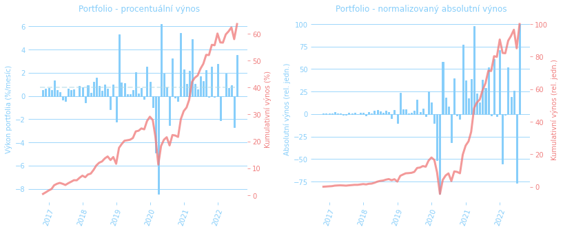 První procentuální pokles výkonnosti (květen 2018) je z důvodu diskontování ceny dluhopisu nakoupeného v půlce roku. Státní dluhopisy znamenaly zpočátku sice pokles úroku, ale díky úplně jinému rizikovému profilu jsme do nich mohli nalít mnohem více peněz – absolutní výnosy silně narostly. A dnes “díky” inflaci rostou i ty relativní.