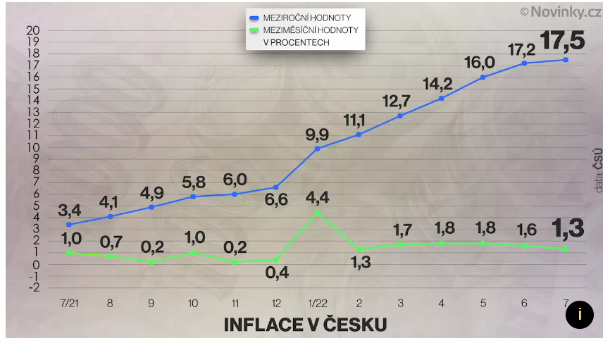 Tady už tolik nadšení necítím. Od roku 2018 jsou věci dražší o třetinu, od začátku tohoto roku skoro o 18%. Není nepravděpodobné, že se jenom za rok 2022 přiblížíme ke zdražení o čtvrtinu. Tady mluvíme o statistické souhrnné inflaci, některé nejzákladnější složky spotřeby narostly výrazněji (např. podle ČSÚ chleba od začátku roku o 34% a máslo o 28%, od poloviny minulého roku pak máslo dokonce o 69%, náklady na bydlení a energie od začátku roku o 26%). Připočítáme-li si, že mzdy tak rychle vůbec nerostou a že portfolia jsou tento rok spíš pod tlakem, je to pro investory nepříjemný mix. Nebo ne?