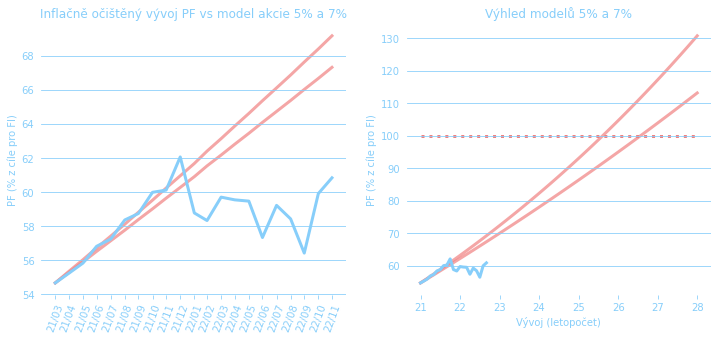 Srovnání růstu hodnoty PF vůči modelu uvažující zhodnocení na úrovni 5% a 7% nad inflaci. Vše vůči poměrně velkorysému finančnímu cíli. Jak vidíme, začátek roku 2022 je prostě špatná kombinace vysoké inflace a poklesu PF. Inflace přidává do tohoto grafu dodatečnou volatilitu, takže to asi bude krasojízda. Nechme se od života překvapit.
