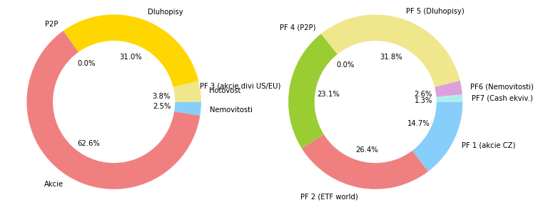 Možná přehlednější než samotná čísla jsou rozklady grafů pro jednotlivá subportfolia PF1–3, pokrývající naše různé akciové zaměření. Rychlé info o aktuálním rozložení PF do těchto složek ilustrují následující koláče (podrobnější, ale ne zcela aktuální strategii najdete v sekci Portfolio).
