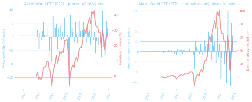 Grafy docela dobře ukazují, že propady trhů za poslední měsíce se týkaly víc technologií a growth akcií. Pokles na PF2 (světová ETF) je už docela markantní. Bližší info o dlouhodobém složení našeho mixu najdete na stránce portfolio.