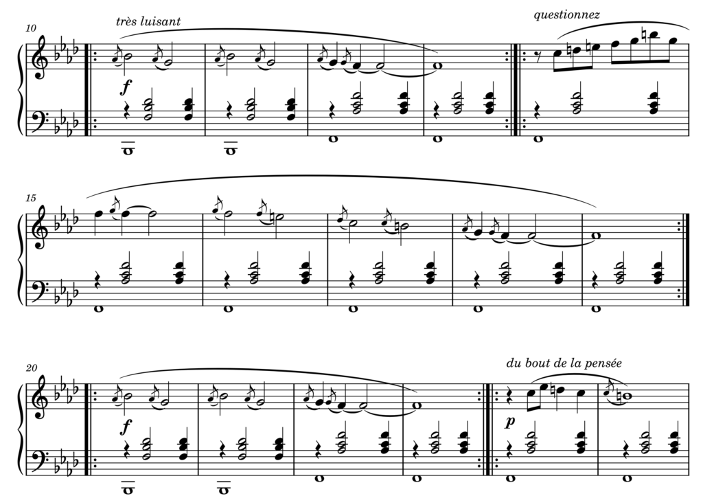 Hlavní zádumčivé melodické téma se ve skladbě dvakrát téměř identicky zopakuje, pak ho oddělí krátká rytmická epizoda a nastoupí druhé, tázavější téma, opět dvakrát zopakované. Znovu epizody a znovu hlavní a po oddělení opět druhé téma. A konec. Samotné opakování ze skladby ještě nutně předzvěst minimalismu nedělá, je jím ta maličká drobnost na čase 1:54, 1:59 a ještě dvakrát později. Pomlka namísto silně očekávaného přírazu mění vyznění a i atmosféru. Tohle později minimalismus dokázal vytěžit naplno: repetitivnost k posluchači promluví, až když je lehce změněna. Tím silněji, čím je změna menší. Hezký příklad je taky třeba v prvním kolenu opery Einstein na pláži od P. Glasse, kde vhodné narušování opakování počítání 1 až 8 dělá z díla docela zajímavou a poslouchatelnou věc 🙂
