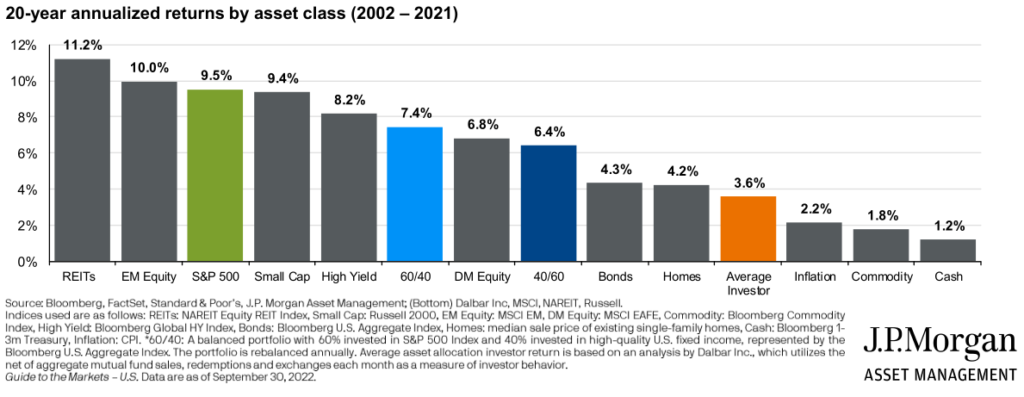 Tou prací u “pasivního” investování je například vypořádání se s rizikem volatility. Ono to zní jako banalita: “Jasně, trhy jsou volatilní, ale když máš investiční horizont dostatečně dlouhý, jsi v chillu, bro.” Ve skutečnosti znám spíš lidi, co v poklesech panikaří, v horším případě PF vyprodávají, v lepším přestanou investice sledovat a rezignují na své pravidelné vklady do PF. Začnou časovat trh, i když to nikdy dělat nechtěli, začnou skákat z jedné třídy aktiv do druhé, začnou se “intenzivně zajímat o XXX”, přestože to jsou nesmyslné kroky vzhledem k jejich cílům a skladbě PF. Výsledkem jsou žalostné výnosy průměrného investora oproti “pasivní” držbě ETFek (kromě grafu níže si můžete podrobnější analýzy fenoménu od společnosti Dalbar prostudovat vygooglením termínu “dalbar average investor”).